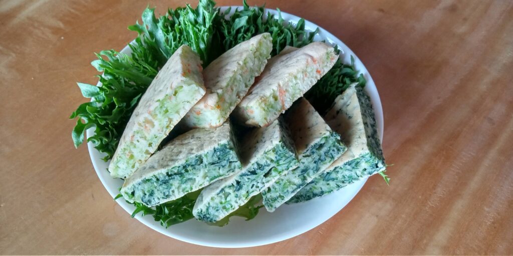 生地を半分にして2種類 キャベツ+人参  と ほうれん草